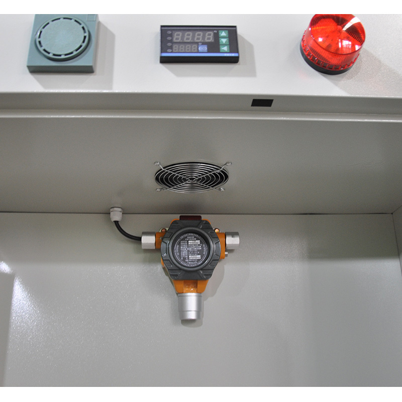 2:柜體內(nèi)有排風(fēng)系統(tǒng),配合報(bào)警裝置,一線(xiàn)鏈接,在報(bào)警后5秒內(nèi)自動(dòng)啟動(dòng)排風(fēng)裝置。稀釋可燃?xì)怏w濃度直至低于芯片切點(diǎn)設(shè)定值